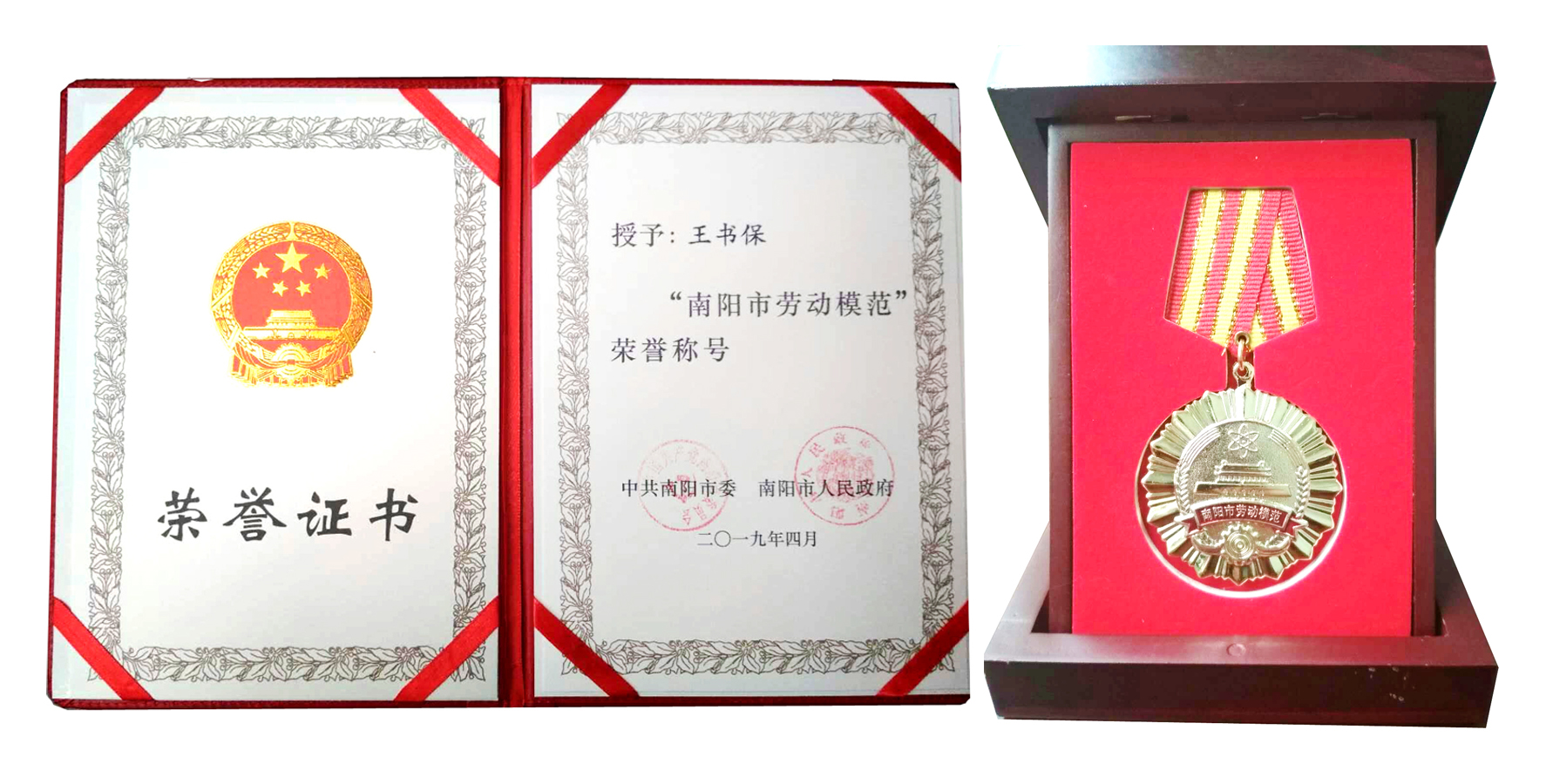 南陽(yáng)市委、市政府授予王書(shū)保“南陽(yáng)市勞動(dòng)模范”榮譽(yù)證書(shū)